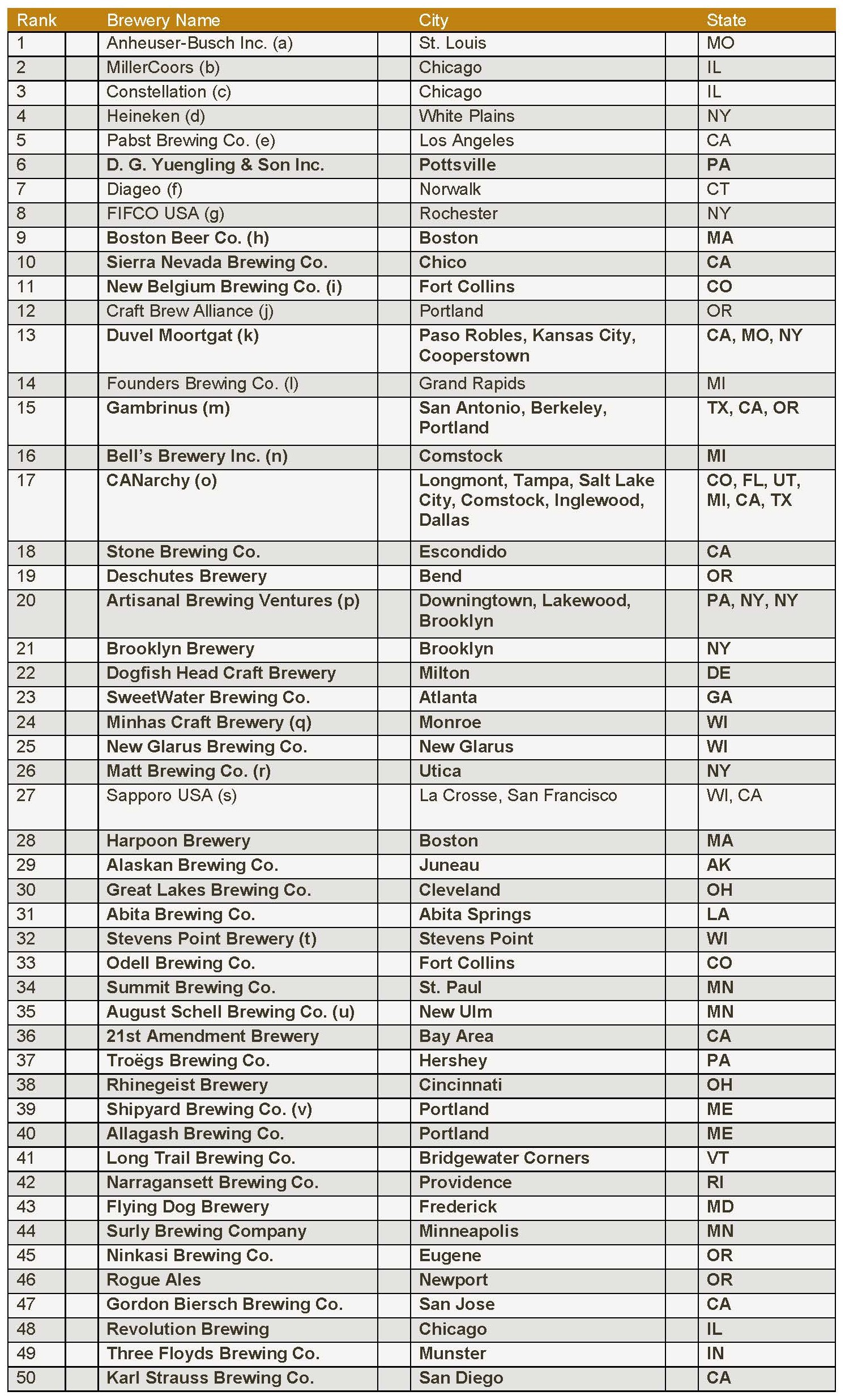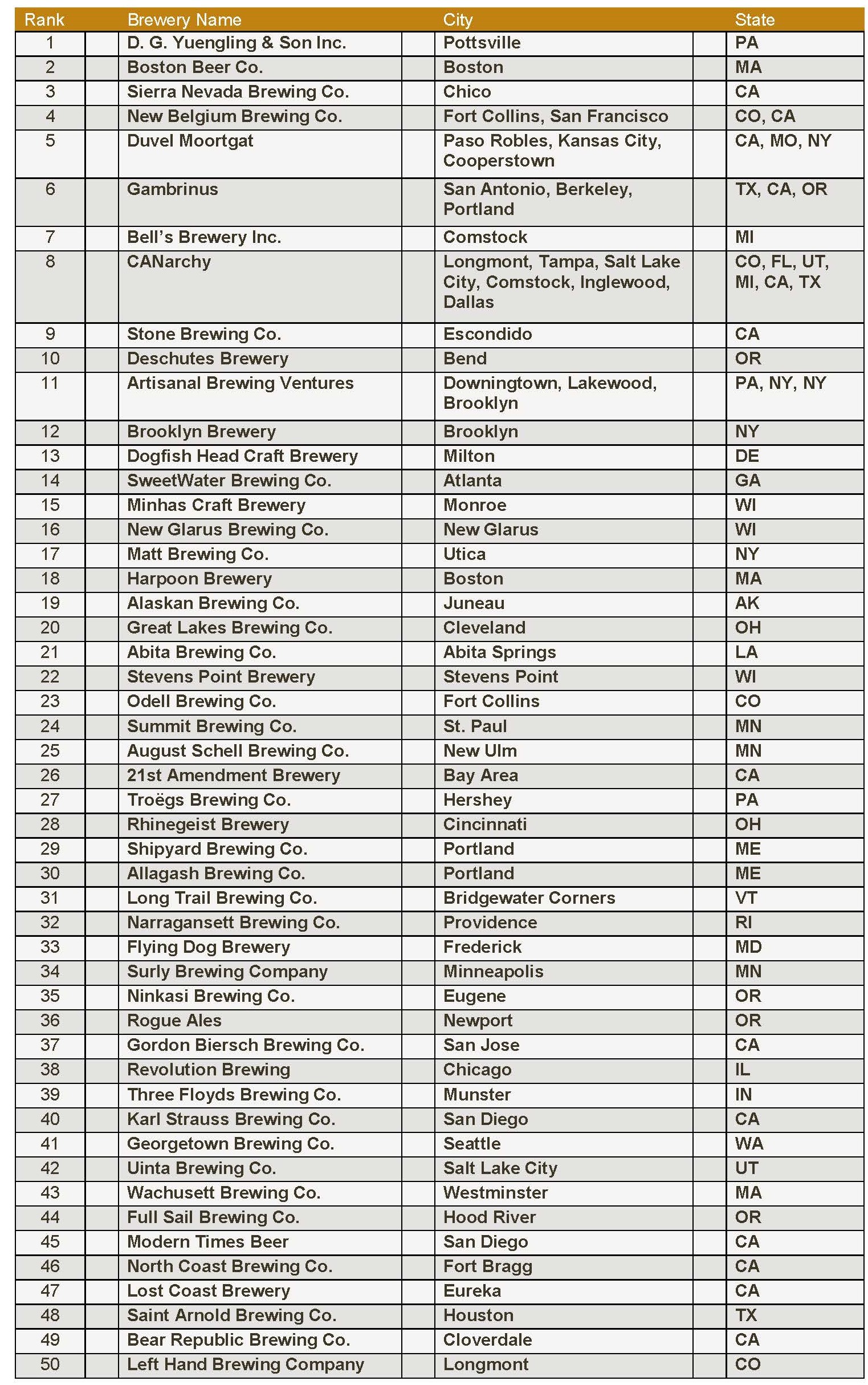 Boulder, Colo.—The Brewers Association (BA)—the not-for-profit trade group representing small and independent craft brewers—released its annual lists of the top 50 producing craft brewing companies and overall brewing companies in the U.S., based on beer sales volume. Of the top 50 overall brewing companies, 40 were small and independent craft brewing companies. (1)